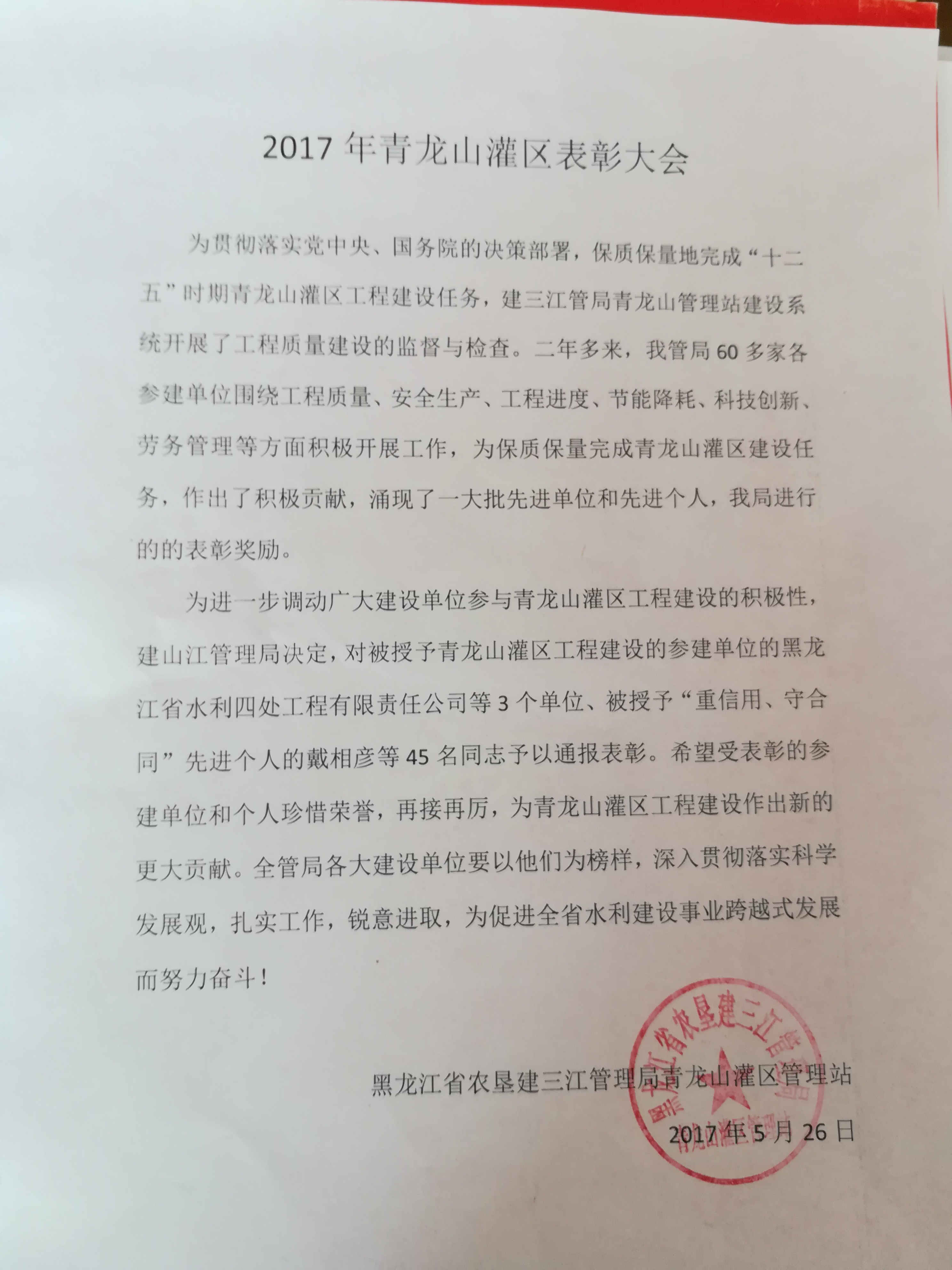 據(jù)悉,青龍山灌區(qū)一期工程參建單位多達(dá)60余家,我公司是其中受到建設(shè)單位命名表彰的3家先進(jìn)單位之一。此外,我公司第四工程分公司的戴相彥同志榮獲“青龍山灌區(qū)工程建設(shè)重合同、守信用先進(jìn)個(gè)人”榮譽(yù)稱號(hào)。