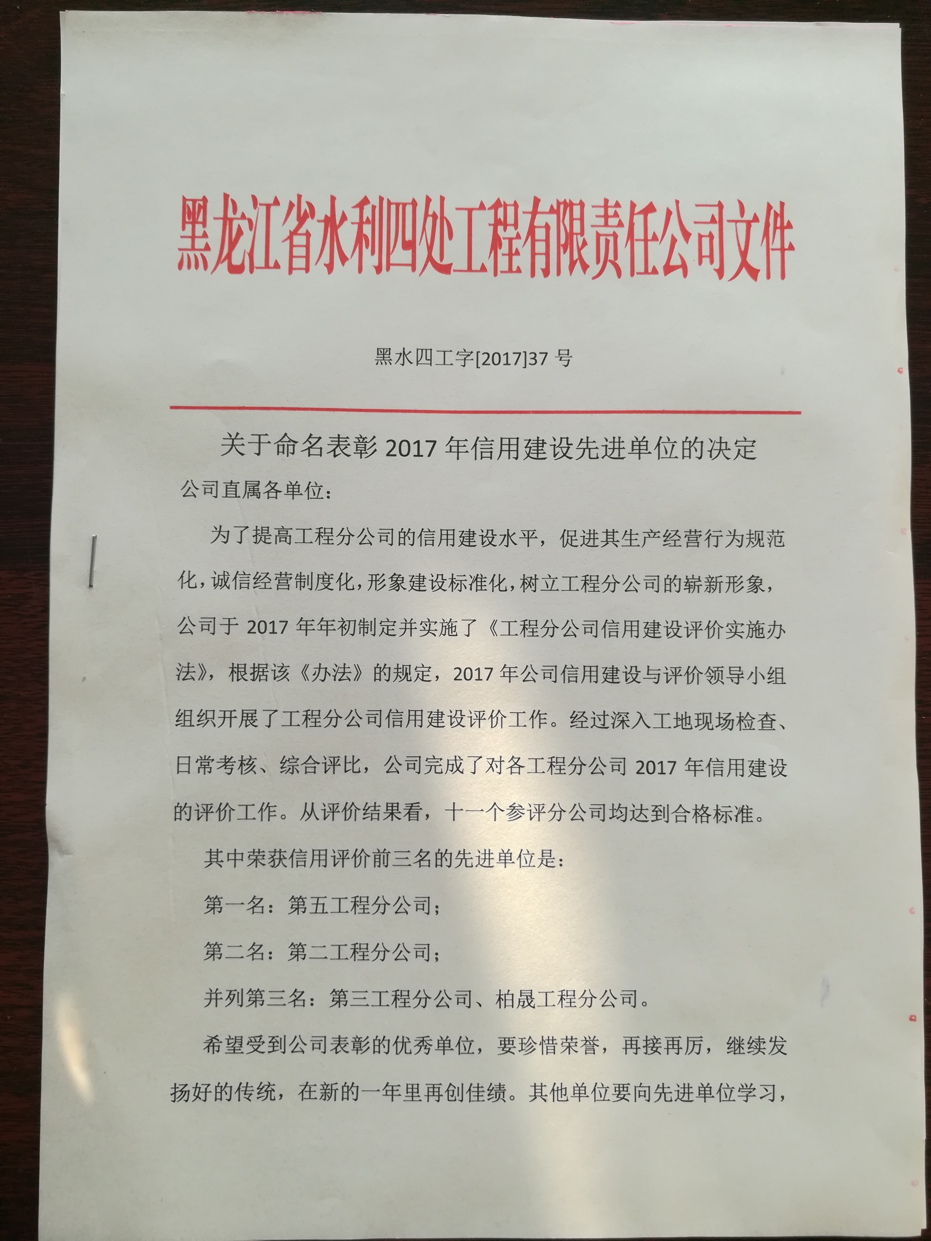 2017年榮獲信用評價前三名的先進單位是:第一名:第五工程分公司;第二名:第二工程分公司;并列第三名:第三工程分公司、柏晟工程分公司。