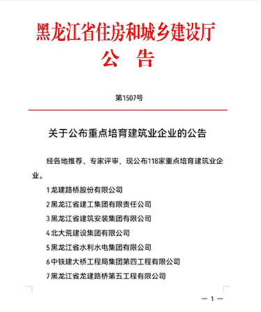 2021年7月,經(jīng)黑龍江省住房和城鄉(xiāng)建設(shè)廳綜合評審,我公司被列入“黑龍江省重點培育建筑業(yè)企業(yè)”名單,標(biāo)志著我公司已躋身于省級重點企業(yè)行列。