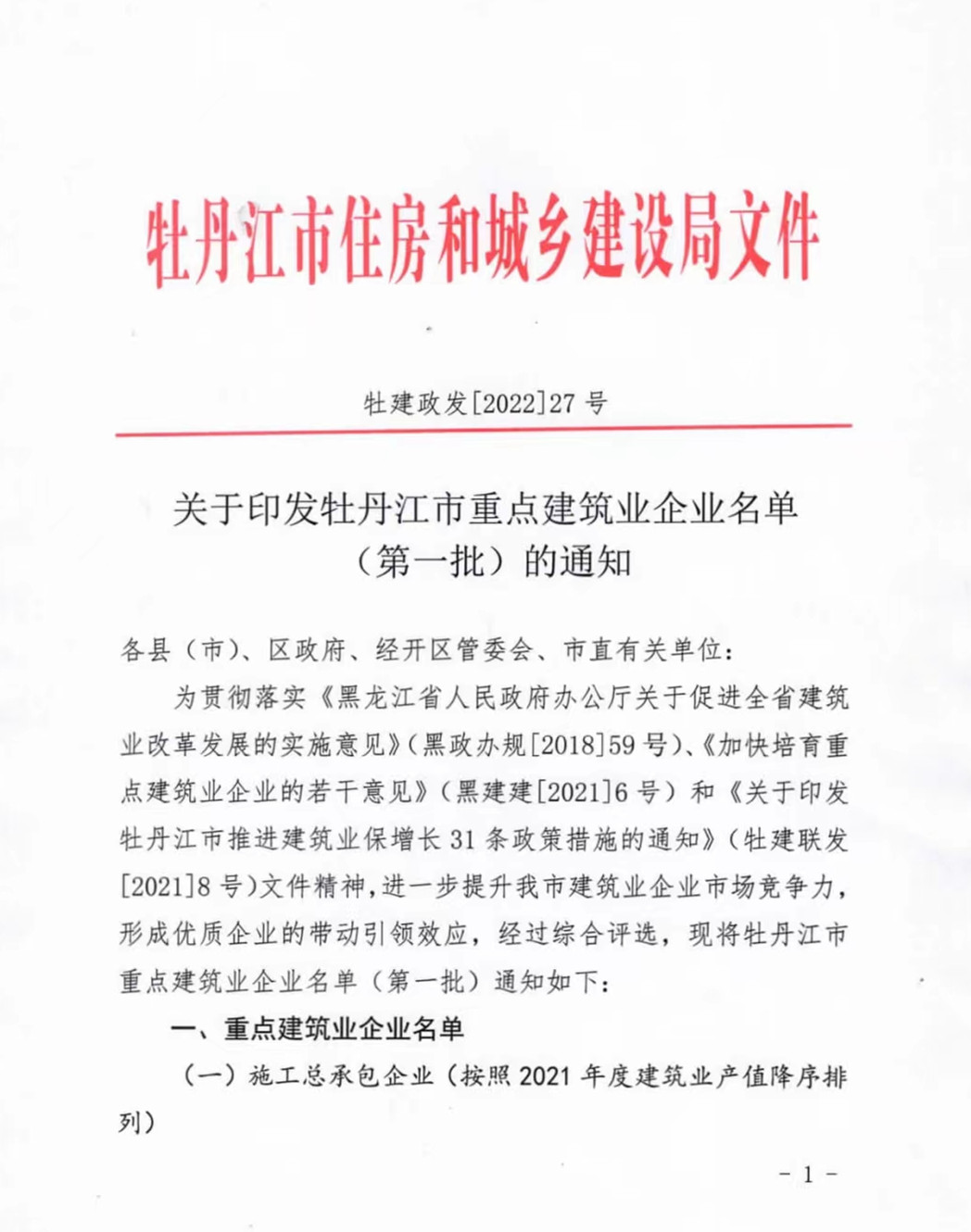 近日,牡丹江市住房和城鄉(xiāng)建設(shè)局下發(fā)文件牡建政發(fā)【2022】27號(hào)《關(guān)于印發(fā)牡丹江市重點(diǎn)建筑企業(yè)名單(第一批)的通知》,我公司霍然躋身全市施工總承包重點(diǎn)企業(yè)行列,名居前二甲。