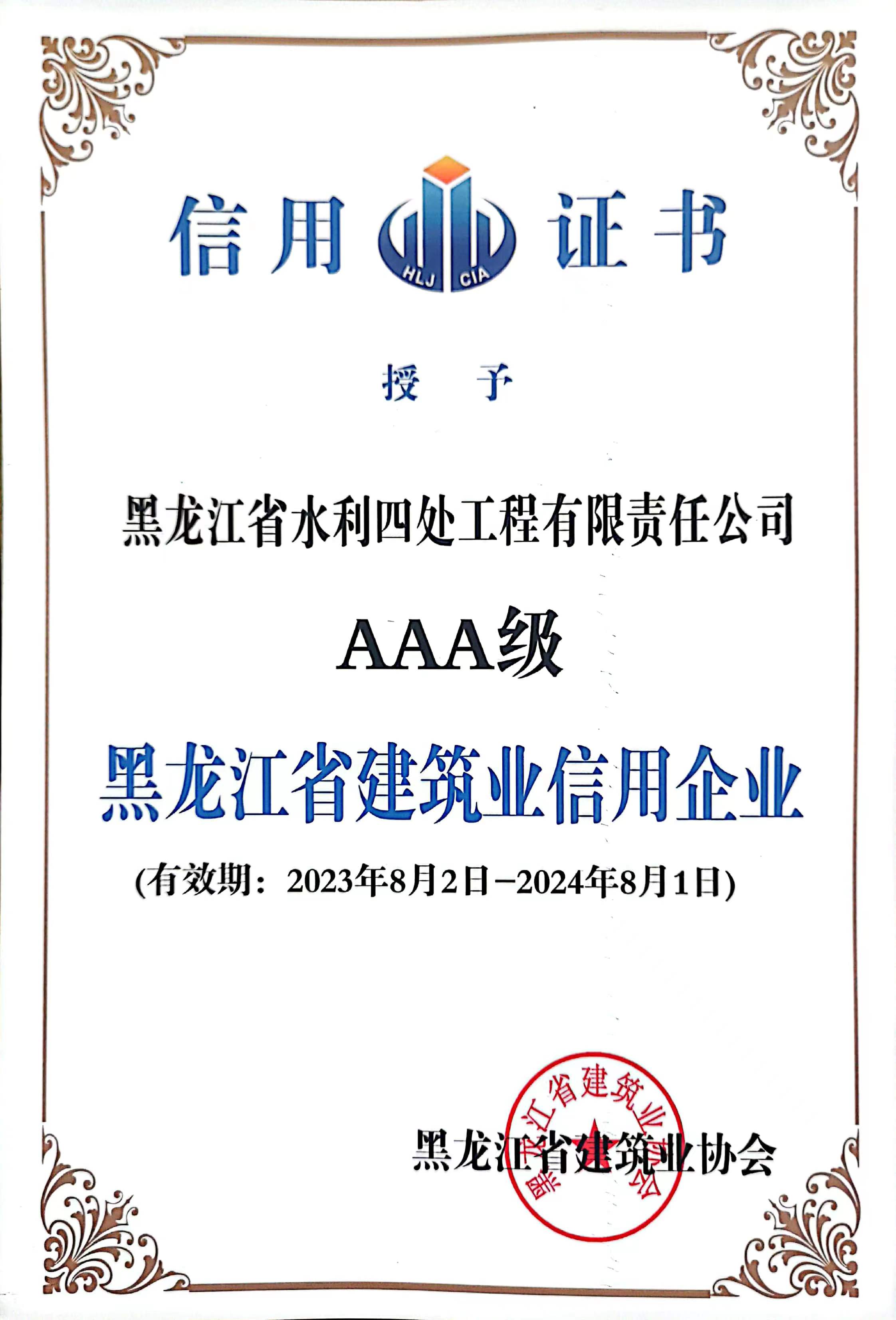 黑龍江省建筑業(yè)AAA級(jí)信用企業(yè)證書(shū)